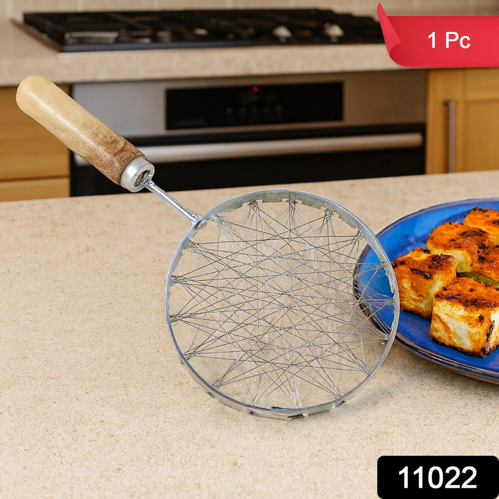 stainless steel wire skimmer, wire skimmer with wooden handle, tandoor style skimmer, oil strainer for frying, frying skimmer, grilling skimmer, kitchen cooking tool, wooden handle skimmer, heat resistant skimmer, tandur papad jali, roti jali, grill jali, barbeque jali, steel roaster