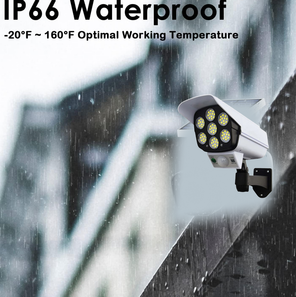 - 2 in 1 Solar Light & Security Dummy Camera -Keep your home property safe and intruders away. With 77 Bright LED, motion-activated, sleek Low profile design. Plus realistic dummy security camera. Detect Intruders, stay away from your household.